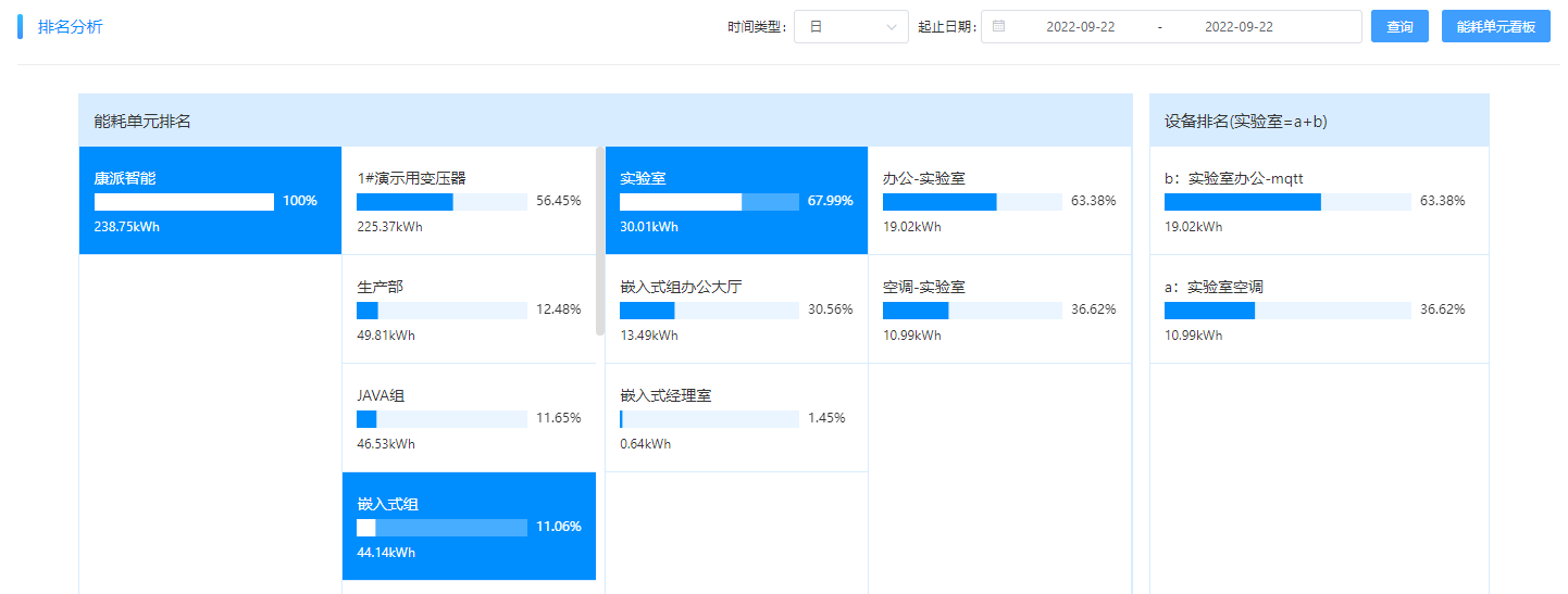 沿途索驥。通過前后兩天的能耗排名變化,確定異常用能部門。嵌入式組的用電排名,22號在第4位,23號升到第二位,多出了5kWh左右。通過對嵌入式組下一級的能耗對比發現為實驗室用能比前一天多了6kWh左右,再進一步對實驗室的下一級能耗分析,發現為實驗室空調比前一日多了6kWh。可以初步確認是實驗室的空調在非工作時間沒有關機。
