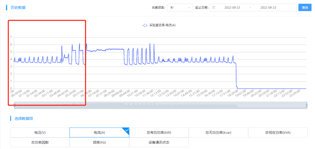 異常用能確認。根據“能源監控—歷史數據分析”來進一步確認異常點的異常數據,9月23日的用能異常確實是“嵌入式組-實驗室-空調”設備未關機造成的。拉取9月22日至9月23日數據,發現,該嵌入式研發實驗室的空調在9月22日上午10點開機后,至次日9月23日下午17點35分左右關機,9月22日未關機。