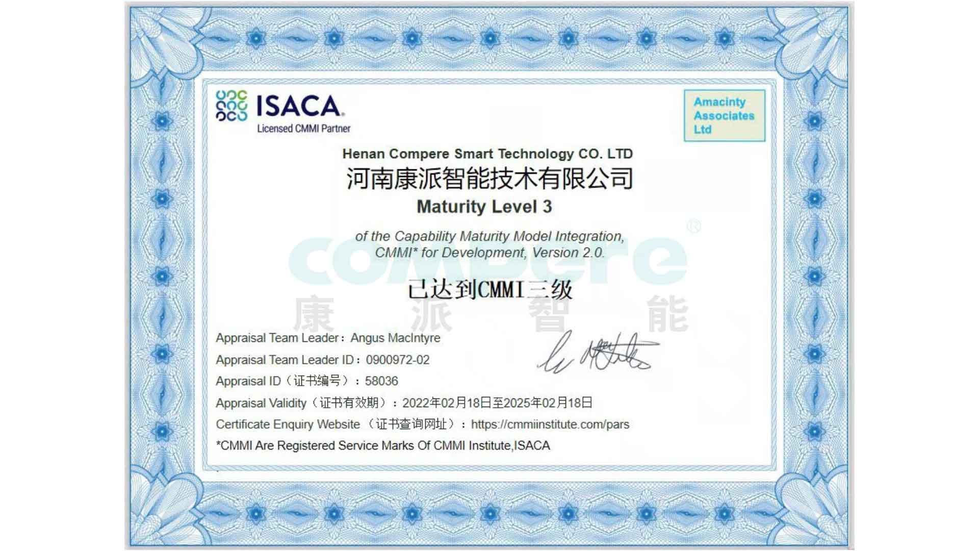 經(jīng)ISACA(國際信息系統(tǒng)審計協(xié)會)的全面評估與審核,河南康派智能技術(shù)有限公司順利通過CMMI2.0-L3級認證!